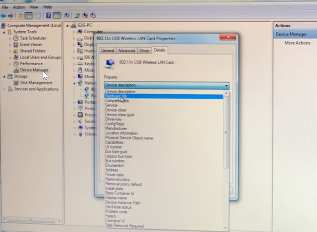 Untuk mengupdatenya kita harus mencari driver yang sesuai. Caranya adalah Klik kanan pada Driver tersebut >> pilih opsi Properties >> Details >> pilih opsi Hardware IDS